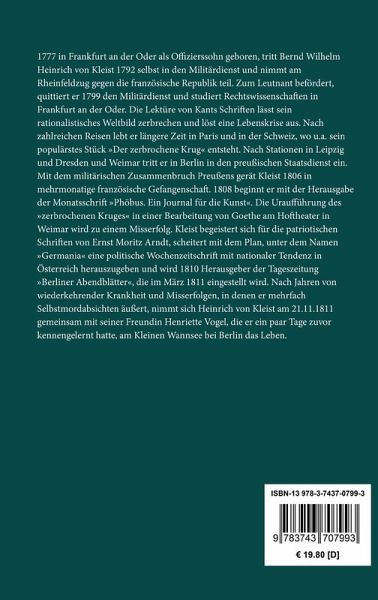 1777 in Frankfurt an der Oder als Offizierssohn geboren, tritt Bernd Wilhelm Heinrich von Kleist 1792 selbst in den Militärdienst und nimmt am Rheinfeldzug gegen die französische Republik teil. Zum Leutnant befördert, quittiert er 1799 den Militärdienst und studiert Rechtswissenschaften in Frankfurt an der Oder. Die Lektüre von Kants Schriften lässt sein rationalistisches Weltbild zerbrechen und löst eine Lebenskrise aus. Nach zahlreichen Reisen lebt er längere Zeit in Paris und in der Schweiz, wo u.a. sein populärstes Stück "Der zerbrochene Krug" entsteht. Nach Stationen in Leipzig und Dresden und Weimar tritt er in Berlin in den preußischen Staatsdienst ein. Mit dem militärischen Zusammenbruch Preußens gerät Kleist 1806 in mehrmonatige französische Gefangenschaft. 1808 beginnt er mit der Herausgabe der Monatsschrift "Phöbus. Ein Journal für die Kunst". Die Uraufführung des "zerbrochenen Kruges" in einer Bearbeitung von Goethe am Hoftheater in Weimar wird zu einem Misserfolg. Kleist begeistert sich für die patriotischen Schriften von Ernst Moritz Arndt, scheitert mit dem Plan, unter dem Namen "Germania" eine politische Wochenzeitschrift mit nationaler Tendenz in Österreich herauszugeben und wird 1810 Herausgeber der Tageszeitung "Berliner Abendblätter", die im März 1811 eingestellt wird. Nach Jahren von wiederkehrender Krankheit und Misserfolgen, in denen er mehrfach Selbstmordabsichten äußert, nimmt sich Heinrich von Kleist am 21.11.1811 gemeinsam mit seiner Freundin Henriette Vogel, die er ein paar Tage zuvor kennengelernt hatte, am Kleinen Wannsee bei Berlin das Leben.