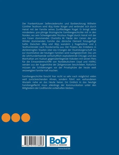 Der Frankenhäuser Seifensiedersohn und Barbierchirurg W.G. Teuthorn wird 1835 Kieler Bürger und verbindet sich durch Heirat mit der Familie seines Zunftkollegen Nagel. Er bringt seine mindestens 300-jährige thüringische Familiengeschichte mit in den Norden, wo sein Schwiegervater Nicolaus Nagel durch Heirat mit der aus Fünen stammenden Charlotta M. Fløcke den Genen der aus Wilster stammenden Familie das dänische Element hinzugefügt hatte. Zwischen 1869 und 1895 wandern 3 Nagelsöhne und 5 Teuthornkinder nach Nordamerika aus. Der Prozess des Einlebens in die Vereinigten Staaten über das Erlangen der Staatsbürgerschaft bis zur Assimilation der heutigen Familien wird nachgezeichnet. Das um die Jahrhundertwende wirtschaftlich explodierende Chicago und das Manhattan am Hudson gegenüberliegende Hoboken mit seinen Piers für die Einwandererschiffe von Norddeutschem Lloyd und HAPAG werden aus der Augenhöhe der Zeitgenossen beschrieben. Natürlich müssen die Schilderungen vor der Privatsphäre der heute weit verzweigten Familie Halt machen. - Familiengeschichte forscht hier nicht so sehr nach möglichst vielen weit zurückreichenden Ahnen, sondern führt von vorhandenen Wurzeln nahe an das Heute heran. Ein Einblick in das heutige Familiengeflecht muss allerdings der Kommunikation unter den Mitgliedern der Großfamilie vorbehalten bleiben.