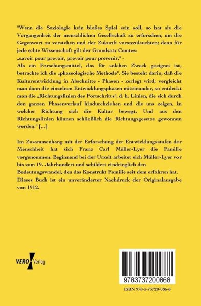 Im Zusammenhang mit der Erforschung der Entwicklungsstufen der Menschheit hat sich Franz Carl Müller-Lyer die Familie vorgenommen. Beginnend bei der Urzeitarbeitet sich Müller-Lyer vor bis zum 19. Jahrhundert und schildert eindringlich den