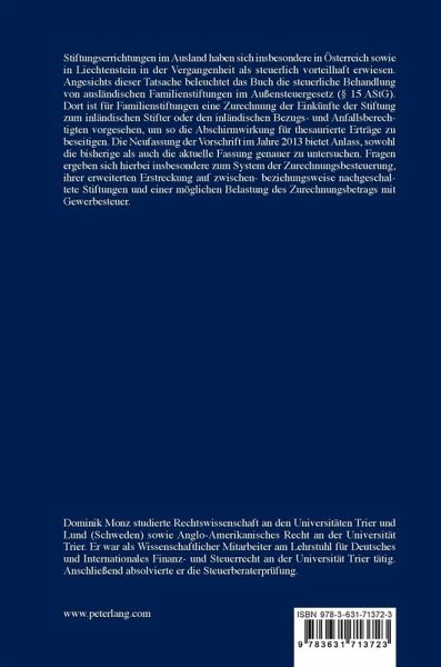 Stiftungserrichtungen im Ausland haben sich insbesondere in Österreich sowie in Liechtenstein in der Vergangenheit als steuerlich vorteilhaft erwiesen. Angesichts dieser Tatsache beleuchtet das Buch die steuerliche Behandlung von ausländischen Familienstiftungen im Außensteuergesetz (§ 15 AStG). Dort ist für Familienstiftungen eine Zurechnung der Einkünfte der Stiftung zum inländischen Stifter oder zum inländischen Bezugs- und Anfallsberechtigten vorgesehen, um so die Abschirmwirkung für thesaurierte Erträge zu beseitigen. Die Neufassung der Vorschrift im Jahre 2013 bietet Anlass, sowohl die bisherige als auch die aktuelle Fassung genauer zu untersuchen. Fragen ergeben sich hierbei insbesondere zum System der Zurechnungsbesteuerung, ihrer erweiterten Erstreckung auf zwischen- beziehungsweise nachgeschaltete Stiftungen und einer möglichen Belastung des Zurechnungsbetrags mit Gewerbesteuer.