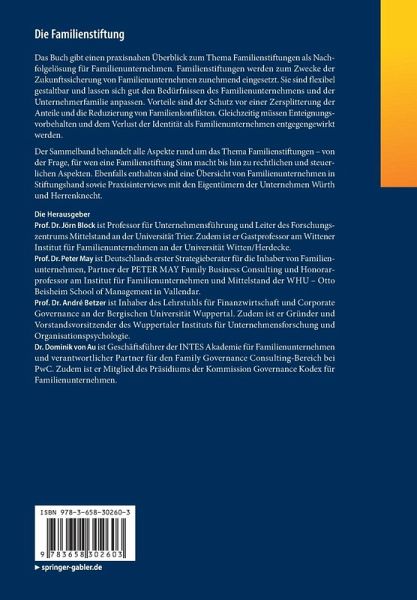 Was ist eine Familienstiftung?.- Pro und Contra Familienstiftung.- Praxisbeispiel 1 - Interview mit Prof. Dr. h. c. mult. Würth.- Die Rechtsstellung des Stifters bzw. der Stifterfamilie im Vergleich zur "klassischen" Gesellschafterstellung.- Führung und Kontrolle von StiftungsunternehmenFinanzielle Aspekte im Kontext von Familienstiftungen.- Nicht ohne meine Familie.- Praxisbeispiel 2 - Interview mit Dr.-Ing. E. h. Herrenknecht und Martin-Devid Herrenknecht.- Die unternehmensverbundene Doppelstiftung als zukunftsorientierte Eigentümerstruktur für Familienunternehmen - Stiftungsorganisation.- Familienstiftungen - Königsinstrument der Unternehmensnachfolge oder nur vorübergehende Modeerscheinung?.- Wesentliche steuerliche Aspekte bei der Familienstiftung.- Anhang.