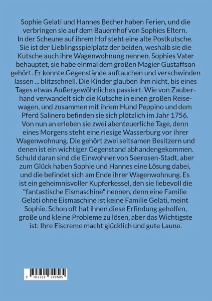 Sophie Gelati und Hannes Becher haben Ferien, und die verbringen sie auf dem Bauernhof von Sophies Eltern. In der Scheune auf ihrem Hof steht eine alte Postkutsche. Sie ist der Lieblingsspielplatz der beiden, weshalb sie die Kutsche auch ihre Wagenwohnung nennen. Sophies Vater behauptet, sie habe einmal dem großen Magier Gustaffson gehört. Er konnte Gegenstände auftauchen und verschwinden lassen ... blitzschnell. Die Kinder glauben ihm nicht, bis eines Tages etwas Außergewöhnliches passiert. Wie von Zauberhand verwandelt sich die Kutsche in einen großen Reisewagen, und zusammen mit ihrem Hund Peppino und dem Pferd Salinero befinden sie sich plötzlich im Jahr 1756. Von nun an erleben sie zwei abenteuerliche Tage, denn eines Morgens steht eine riesige Wasserburg vor ihrer Wagenwohnung. Die gehört zwei seltsamen Besitzern und denen ist ein wichtiger Gegenstand abhandengekommen. Schuld daran sind die Einwohner von Seerosen-Stadt, aber zum Glück haben Sophie und Hannes eine Lösung dabei, und die befindet sich am Ende ihrer Wagenwohnung. Es ist ein geheimnisvoller Kupferkessel, den sie liebevoll die "fantastische Eismaschine" nennen, denn eine Familie Gelati ohne Eismaschine ist keine Familie Gelati, meint Sophie. Schon oft hat ihnen diese Erfindung geholfen, große und kleine Probleme zu lösen, aber das Wichtigste ist: Ihre Eiscreme macht glücklich und gute Laune.