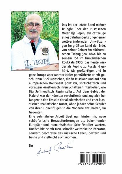 Das ist der letzte Band meiner Trilogie über den russischen Maler Ilja Repin, ein Zeitzeuge eines Jahrhunderts ungeheurer weltverändernder Umwälzungen im größten Land der Erde, von seiner Geburt im südrussischen Tschugujew 1844 bis zu seinem Tod im finnländischen Koukkala 1930, das heute wieder als Repino zu Russland gehört. Als großartiger und in ganz Europa anerkannter Maler porträtierte er mit geschultem Blick Menschen, die in Russland und auf dem europäischen Kontinent politisch, wirtschaftlich und vor allem künstlerisch ihren Schatten hinterließen, wie Ilja Jefimowitsch Repin selbst. Auf dem Gebiet der Malerei war der Künstler revolutionär und zugleich befangen in den Fesseln der akademischen und eher klassischen realistischen Kunst, ohne jedoch seine Schüler von ihren Höhenflügen in die Moderne abzuhalten, im Gegenteil. Eine zehnjährige Arbeit liegt nun hinter mir, neue schöpferische Herausforderungen als bekennender Europäer und humanistischer Schriftsteller warten. Und ich bleibe mir treu, schreibe weiter keine Literatur, sondern beschreibe das russische Leben, gestern und heute und vielleicht auch morgen.