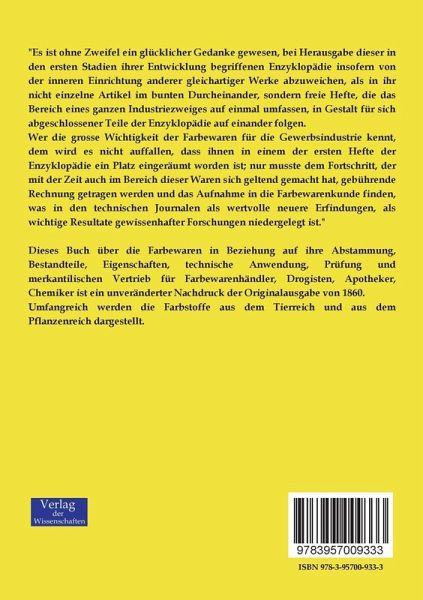 Dieses Buch über die Farbewaren in Beziehung auf ihre Abstammung, Bestandteile, Eigenschaften, technische Anwendung, Prüfung und merkantilischen Vertrieb für Farbewarenhändler, Drogisten, Apotheker, Chemiker ist ein unveränderter Nachdruck der Originalausgabe von 1860.