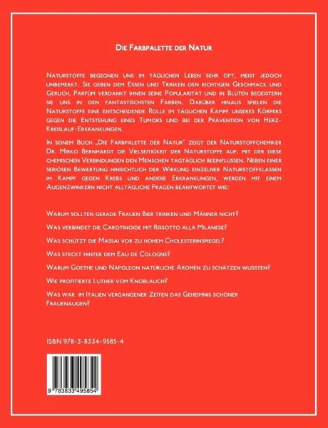 Naturstoffe begegnen uns im täglichen Leben sehr oft, meist jedoch unbemerkt. Sie geben dem Essen und Trinken den richtigen Geschmack und Geruch, Parfüm verdankt ihnen seine Popularität und in Blüten begeistern sie uns in den fantastischsten Farben. Darüber hinaus spielen die Naturstoffe eine entscheidende Rolle im täglichen Kampf unseres Körpers gegen die Entstehung eines Tumors und bei der Prävention von Herz-Kreislauf-Erkrankungen.In seinem Buch "Die Farbpalette der Natur" zeigt der Naturstoffchemiker Dr. Mirko Bernhardt die Vielseitigkeit der Naturstoffe auf, mit der diese chemischen Verbindungen den Menschen tagtäglich beeinflussen. Neben einer seriösen Bewertung hinsichtlich der Wirkung einzelner Naturstoffklassen im Kampf gegen Krebs und andere Erkrankungen, werden mit einem Augenzwinkern nicht alltägliche Fragen beantwortet wie: Warum sollten gerade Frauen Bier trinken und Männer nicht?Was verbindet die Carotinoide mit Rissotto alla Milanese?Was schützt die Massai vor zu hohem Cholesterinspiegel?Was steckt hinter dem Eau de Cologne?Warum Goethe und Napoleon natürliche Aromen zu schätzen wussten?Wie profitierte Luther vom Knoblauch?Was war im Italien vergangener Zeiten das Geheimnis schöner Frauenaugen?