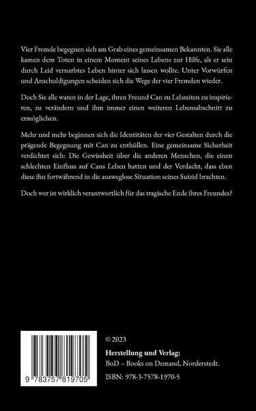 Vier Fremde begegnen sich am Grab eines gemeinsamen Bekannten. Sie alle kamen dem Toten in einem Moment seines Lebens zur Hilfe, als er sein durch Leid vernarbtes Leben hinter sich lassen wollte. Unter Vorwürfen und Anschuldigungen scheiden sich die Wege der vier Fremden wieder.Doch Sie alle waren in der Lage, ihren Freund Can zu Lebzeiten zu inspirieren, zu verändern und ihm immer einen weiteren Lebensabschnitt zu ermöglichen.Mehr und mehr beginnen sich die Identitäten der vier Gestalten durch die prägende Begegnung mit Can zu enthüllen. Eine gemeinsame Sicherheit verdichtet sich: Die Gewissheit über die anderen Menschen, die einen schlechten Einfluss auf Cans Leben hatten und der Verdacht, dass eben diese ihn fortwährend in die ausweglose Situation seines Suizid brachten.Doch wer ist wirklich verantwortlich für das tragische Ende ihres Freundes?