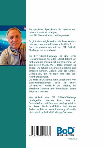 Ein Sport-Event, dass ALLE herausfordert und begeistert! Es gibt viele Möglichkeiten die leere Vereins- oder auch Mann-schaftskasse aufzufüllen!Doch so einfach wie mit der FFP Fußball-Challenge war es noch nie! Die FFP-Fußball-Challenge ist eine echte Herausforderung für jedes Fußball-Talent, sein wahres Können unter Beweis zu stellen und allen zu zeigen, was in ihm steckt. An fünf Stationen messen sich die Teilnehmer um den besten SCORE-WERT. Dabei müssen sie zeigen, wie schnell sie sprinten, dribbeln, und schießen können. Zudem wird die Schuss-Genauigkeit, die Ausdauer und das Ball-Hochhalten erfasst. Die FFP Fußball-Challenge-Software berechnet dann, anhand der erbrachten Resultate, den Score-Wert für jede Alters- und Geschlechter-gruppe.Somit können Sieger ermittelt und gekrönt werden. Die FFP Fußball-Challenge kann unabhängig von Eventveran-staltungen auch als Short-Leistungstest innerhalb des Vereins, bei einzelnen Spielern und Mannschaften eingesetzt werden. Sie ist schnell aufgebaut und benötigt wenig Platz (1/2 Spielfeld). Wie einfach eine FFP Fußball-Challenge durchgeführt werden kann, was an Gerätschaften und Personen benötigt wird, ist in diesem Buch ausführlich beschrieben. Zudem enthält es den Anforderungs-Code für die kostenlose FFP Fußball-Challenge Software.Die FFP Fußball-Challenge ist ein Produkt aus dem Bereich der Leistungsdiagnostik im Amateur- und Jugendfußball.