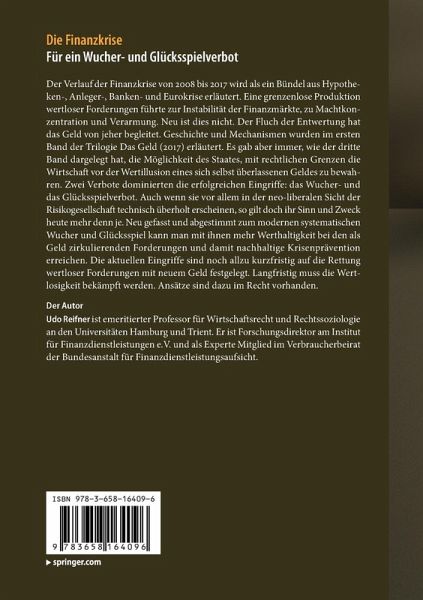 Der Verlauf der Finanzkrise von 2008 bis 2017 wird als ein Bündel aus Hypotheken-, Anleger-, Banken- und Eurokrise erläutert. Eine grenzenlose Produktion wertloser Forderungen führte zur Instabilität der Finanzmärkte, zu Machtkonzentration und Verarmung. Neu ist dies nicht. Der Fluch der Entwertung hat das Geld von jeher begleitet. Geschichte und Mechanismen wurden im ersten Band der Trilogie Das Geld (2017) erläutert. Es gab aber immer, wie der dritte Band dargelegt hat, die Möglichkeit des Staates, mit rechtlichen Grenzen die Wirtschaft vor der Wertillusion eines sich selbst überlassenen Geldes zu bewahren. Zwei Verbote dominierten die erfolgreichen Eingriffe: das Wucher- und das Glücksspielverbot. Auch wenn sie vor allem in der neo-liberalen Sicht der Risikogesellschaft technisch überholt erscheinen, so gilt doch ihr Sinn und Zweck heute mehr denn je. Neu gefasst und abgestimmt zum modernen systematischen Wucher und Glücksspiel kann man mit ihnen mehr Werthaltigkeit bei den als Geldzirkulierenden Forderungen und damit nachhaltige Krisenprävention erreichen. Die aktuellen Eingriffe sind noch allzu kurzfristig auf die Rettung wertloser Forderungen mit neuem Geld festgelegt. Langfristig muss die Wertlosigkeit bekämpft werden. Ansätze sind dazu im Recht vorhanden.