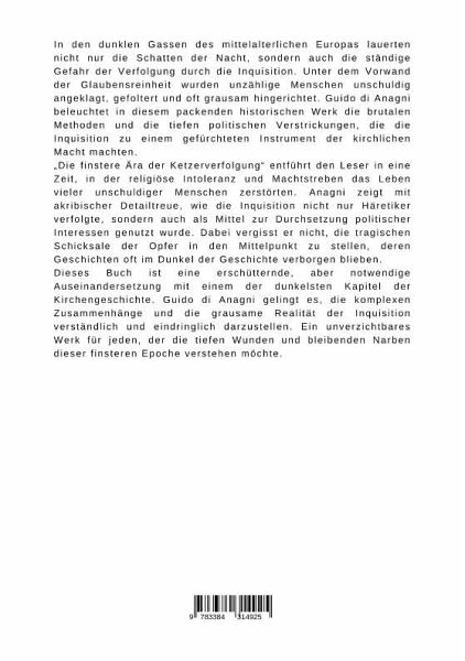 In den dunklen Gassen des mittelalterlichen Europas lauerten nicht nur die Schatten der Nacht, sondern auch die ständige Gefahr der Verfolgung durch die Inquisition. Unter dem Vorwand der Glaubensreinheit wurden unzählige Menschen unschuldig angeklagt, gefoltert und oft grausam hingerichtet. Guido di Anagni beleuchtet in diesem packenden historischen Werk die brutalen Methoden und die tiefen politischen Verstrickungen, die die Inquisition zu einem gefürchteten Instrument der kirchlichen Macht machten."Die finstere Ära der Ketzerverfolgung" entführt den Leser in eine Zeit, in der religiöse Intoleranz und Machtstreben das Leben vieler unschuldiger Menschen zerstörten. Anagni zeigt mit akribischer Detailtreue, wie die Inquisition nicht nur Häretiker verfolgte, sondern auch als Mittel zur Durchsetzung politischer Interessen genutzt wurde. Dabei vergisst er nicht, die tragischen Schicksale der Opfer in den Mittelpunkt zu stellen, deren Geschichten oft im Dunkel der Geschichte verborgen blieben.Dieses Buch ist eine erschütternde, aber notwendige Auseinandersetzung mit einem der dunkelsten Kapitel der Kirchengeschichte. Guido di Anagni gelingt es, die komplexen Zusammenhänge und die grausame Realität der Inquisition verständlich und eindringlich darzustellen. Ein unverzichtbares Werk für jeden, der die tiefen Wunden und bleibenden Narben dieser finsteren Epoche verstehen möchte.