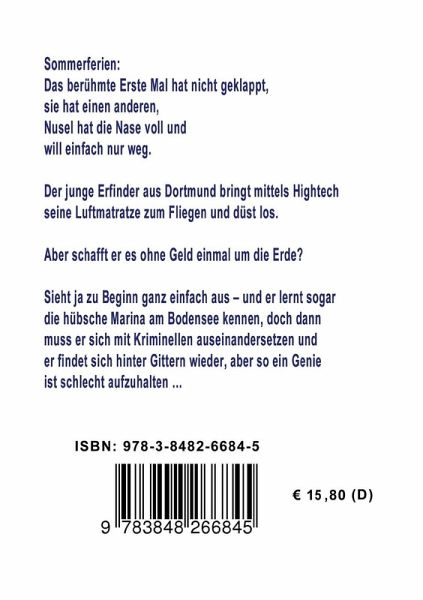 Sommerferien: Das berühmte Erste Mal hat nicht geklappt, sie hat einen anderen, Nusel hat die Nase voll und will einfach nur weg.Der junge Erfinder aus Dortmund bringt mittels Hightech seine Luftmatratze zum Fliegen und düst los.Aber schafft er es ohne Geld einmal um die Erde?Sieht ja zu Beginn ganz einfach aus - und er lernt sogar die hübsche Marina am Bodensee kennen, doch später muss er sich mit Kriminellen auseinandersetzen und er findet sich hinter Gittern wieder. Aber so ein Genie ist kaum aufzuhalten ...