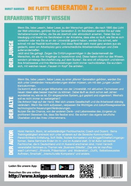 Der Junge.Wenn Sie, liebe Leserin, lieber Leser, zu den Menschen gehören, die nach 1995 das Licht der Welt erblickten, gehören Sie zur Generation Z. Im Berufsleben werden Sie auf viele Verhaltensmuster treffen, die Sie als überholt oder altmodisch ansehen. Treten Sie nun blauäugig und kreativ ins Berufsleben in der Annahme, dass alles so läuft, wie Sie es sich vorstellen oder wie Sie es an der Universität gelernt haben, werden Sie schnell, sehr schnell mit der Realität konfrontiert. Und diese Realität sieht meist ganz anders aus als gedacht, wenn am Arbeitsplatz ganz unterschiedliche Arbeitseinstellungen und Ziele aufeinandertreffen. Jetzt sind Sie gefragt. Zeigen Sie Einfühlungsvermögen in die Gedankenwelt der Menschen, die als ihre Vorgänger zu bezeichnen sind. Diese haben nicht nur das Wissen, sondern jahrelange Berufserfahrung 'auf dem Buckel'. Sie sind oft erfolgreich und können Ihre Arbeitsweise und Ihre Wertevorstellungen nicht immer nachvollziehen. Sie wundern sich, mit welchen neuen 'Flausen im Kopf' Sie antreten. Der Alte.Wenn Sie, liebe Leserin, lieber Leser, zu einer 'älteren' Generation gehören, werden Sie sich unter Umständen Herausforderungen stellen müssen, um mit den 'jungen Leuten' klarzukommen.Da kommt eben ein junger Mitarbeiter von der Universität, und glaubt mit aktuellem Fachwissen und neuen Ideen alles besser machen zu können. Dabei läuft es doch schon seit Jahren wunderbar so, wie es ist. Ein eingespieltes System, gut geplant und organisiert. Weshalb soll es nicht immer so weitergehen?Die Antwort liegt auf der Hand. Weil sich unsere Gesellschaft und der Arbeitsalltag ständig verändern. Wenn Sie nicht aufpassen, verpassen Sie Wichtiges und zukunftswegweisende technologische Neuerungen/Veränderungen/Entwicklungen.Nutzen Sie die Chance, von der anderen Denkweise und Lebenseinstellung des Jüngeren zu profitieren! Beweisen Sie, dass Sie flexibel sind. Sie sichern das eigene berufliche Überleben und das Ihres Unternehmens.