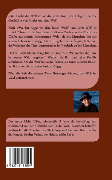 "Die Flucht des Wolfes!" ist der letzte Band der Trilogie über die Geschichte von Moritz und dem Wolf. Nach "Wer hat Angst vor dem bösen Wolf?" und "Der Wolf ist zurück!" handelt die Geschichte in diesem Buch von der Flucht des Wolfes aus seinem beheimateten Wald, da die Menschen ihn aus seinem Lebensraum verjagt haben. Es geht um die Ängste, Nöte und das Verhalten der Tiere untereinander im Vergleich zu den Menschen.Diesmal kann Moritz wenig für den Wolf tun. Wie werden die Tiere im neuen Wald reagieren? Werden sie ihn und seine Familie aufnehmen? Ob der Wolf mit seiner Familie ein neues Zuhause findet, ist alleine von der schlauen Eule abhängig. Wird die Eule die anderen Tiere überzeugen können, den Wolf im Wald aufzunehmen?