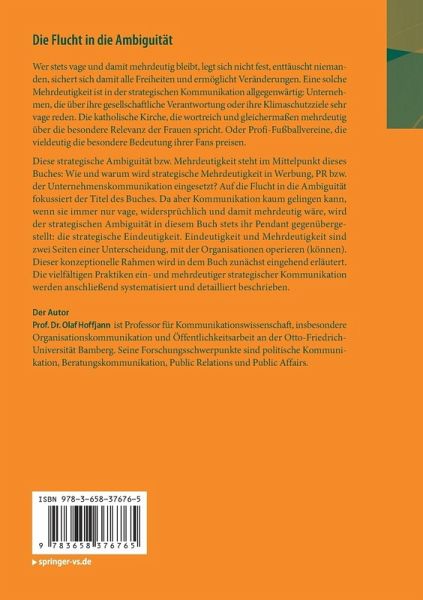 Diese strategische Ambiguität bzw. Mehrdeutigkeit steht im Mittelpunkt dieses Buches: Wie und warum wird strategische Mehrdeutigkeit in Werbung, PR bzw. der Unternehmenskommunikation eingesetzt? Auf diese Flucht in die Ambiguität fokussiert der Titel des Buches. Da aber Kommunikation kaum gelingen kann, wenn sie immer nur vage, widersprüchlich und damit mehrdeutig wäre, wird der strategischen Ambiguität in diesem Buch stets ihr Pendant gegenübergestellt: die strategische Eindeutigkeit. Eindeutigkeit und Mehrdeutigkeit sind zwei Seiten einer Unterscheidung, mit der Organisationen operieren (können). Dieser konzeptionelle Rahmen wird in dem Buch zunächst eingehend erläutert. Die vielfältigen Praktiken ein- und mehrdeutiger strategischer Kommunikation werden anschließend systematisiert und detailliert beschrieben.