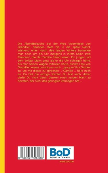 Textauszug: Die Abendbesuche bei der Frau Vicomtesse von Grandlieu dauerten stets bis in die späte Nacht. Während einer Nacht des langen Winters bemerkte man noch um ein Uhr morgens in ihrem Salon zwei Personen, die der Familie fremd waren. Ein junger und sehr artiger Mann ging, als er die Uhr schlagen hörte. Als man seinen Wagen fortrollen hörte, blickte Frau von Grandlieu etwas unruhig um sich ... ging auf ihre Tochter zu, um mit dieser zu sprechen. ..."Camille ... höre mich an: Du bist die einzige Tochter, Du bist reich; daher darfst Du nicht daran denken einen jungen Mann zu heiraten, der nicht das geringste Vermögen hat ...