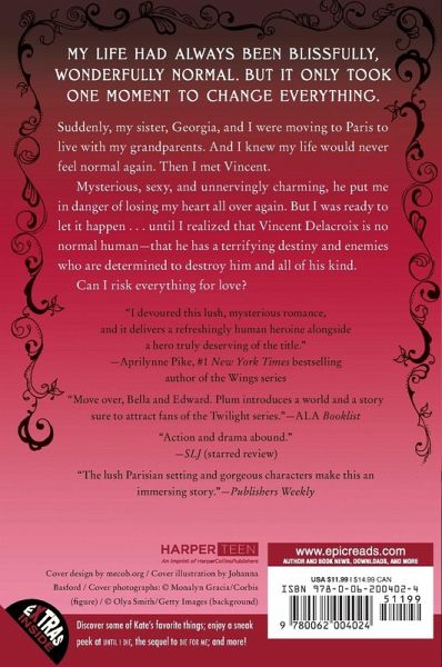 My life had always been blissfully, wonderfully normal. But it only took one moment to change everything. Suddenly, my sister, Georgia, and I were moving to Paris to live with my grandparents. And I knew my life would never feel normal again. Then I met Vincent. Mysterious, sexy, and unnervingly charming, he put me in danger of losing my heart all over again. But I was ready to let it happen . . . until I realized that Vincent Delacroix is no normal human?that he has a terrifying destiny and enemies who are determined to destroy him and all of his kind. Can I risk everything for love?