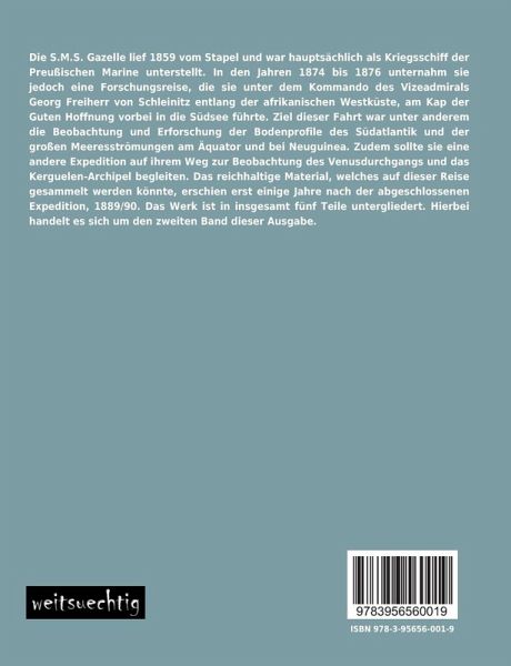 Die S.M.S. Gazelle lief 1859 vom Stapel und war hauptsächlich als Kriegsschiff der Preußischen Marine unterstellt. In den Jahren 1874 bis 1876 unternahm sie jedoch eine Forschungsreise, die sie unter dem Kommando des Vizeadmirals Georg Freiherr von Schleinitz entlang der afrikanischen Westküste, am Kap der Guten Hoffnung vorbei in die Südsee führte. Ziel dieser Fahrt war unter anderem die Beobachtung und Erforschung der Bodenprofile des Südatlantik und der großen Meeresströmungen am Äquator und bei Neuguinea. Zudem sollte sie eine andere Expedition auf ihrem Weg zur Beobachtung des Venusdurchgangs und das Kerguelen-Archipel begleiten. Das reichhaltige Material, welches auf dieser Reise gesammelt werden könnte, erschien erst einige Jahre nach der abgeschlossenen Expedition, 1889/90. Das Werk ist in insgesamt fünf Teile untergliedert. Hierbei handelt es sich um den zweiten Band dieser Ausgabe.