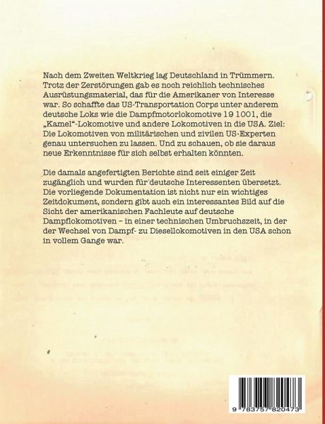Nach dem Zweiten Weltkrieg lag Deutschland in Trümmern. Trotz der Zerstörungen gab es noch reichlich technisches Ausrüstungsmaterial, das für die Amerikaner von Interesse war. So schaffte das US-Transportation Corps unter anderem deutsche Loks wie die Dampfmotorlokomotive 19 1001, die "Kamel"-Lokomotive und andere Lokomotiven in die USA. Ziel: Die Lokomotiven von militärischen und zivilen US-Experten genau untersuchen zu lassen. Und zu schauen, ob sie daraus neue Erkenntnisse für sich selbst erhalten könnten.Die damals angefertigten Berichte sind seit einiger Zeit zugänglich und wurden für deutsche Interessenten übersetzt. Die vorliegende Dokumentation ist nicht nur ein wichtiges Zeitdokument, sondern gibt auch ein interessantes Bild auf die Sicht der amerikanischen Fachleute auf deutsche Dampflokomotiven - in einer technischen Umbruchszeit, in der der Wechsel von Dampf- zu Diesellokomotiven in den USA schon in vollem Gange war.