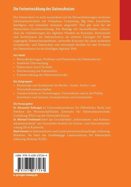 Herausforderungen, Probleme und Paradoxien des Datenschutzes.- Staatliche Überwachung.- Datenschutz durch Technik.- Durchsetzung von Datenschutz.- Fortentwicklung des Datenschutzrechts.