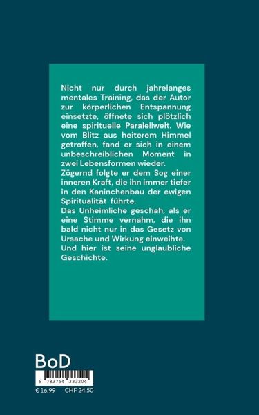 Nicht nur durch jahrelanges mentales Training, das der Autor ursprünglich zur körperlichen Entspannung einsetzte, öffnete sich bald eine spirituelle Parallelwelt. Wie vom Blitz aus heiterem Himmel getroffen überraschte es ihn und zog ihn immer tiefer in ihren Bann.Zögernd folgte er dem Sog einer inneren Stimme, die ihn bald nicht nur über den Ursprung des Lebens aufklärte.Auch das Gesetz von Ursache und Wirkung wurde ihm enthüllt.Immer tiefer zog es ihn in den Kaninchenbau der ewigen Spiritualität.