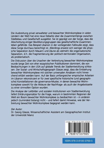 Die Ausbreitung privat verwalteter und bewachter Wohnkomplexe in vielen Ländern der Welt hat eine neue Debatte über die Zusammenhänge zwischen Städtebau und Gesellschaft ausgelöst. Sie ist geprägt von der Sorge, dass die Abschottung einiger Bevölkerungsgruppen das gesellschaftliche Zusammenleben gefährde. Das Beispiel Libanon in der vorliegenden Fallstudie zeigt, dass diese Sorge durchaus berechtigt ist. Allerdings erweist sich weniger die psychische Separation durch Mauern und Zäune als vielmehr die organisatorische Separation, d.h. die Fragmentierung der politisch-territorialen Organisation, als problematisch. Die Diskussion über die Ursachen der Verbreitung bewachter Wohnkomplexe wurde lange Zeit von eher essayistischen Publikationen dominiert, die von Beobachtungen in den USA auf globale Trends der Stadtentwicklung schlossen. Der Sozial- und Wirtschaftsgeograph Glasze zeigt, dass die Entstehung bewachter Wohnkomplexe mit solchen universalen Ansätzen nicht hinreichend erklärt werden kann. Auf der Basis umfangreicher empirischer Arbeiten im Libanon rekonstruiert er für zwei spezifische historische (und geographische) Konstellationen die governance-Muster, in denen bewachte Wohnkomplexe sowohl für die Akteure der Nachfrage- als auch der Angebotsseite zu einer sinnvollen Option wurden. Die Analyse der Leitbilder und sozialen Institutionen von Stadtentwicklung liefert Erklärungsansätze für die Frage, warum in bestimmten Regionen der Welt ein Boom bewachter Wohnkomplexe zu beobachten ist - in anderen jedoch (zumindest bislang) nicht - und liefert damit Hinweise, wie der Verbreitung bewachter Wohnkomplexe begegnet werden kann.