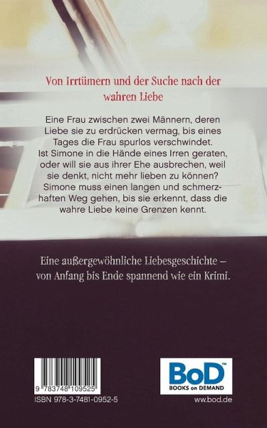 Von Irrtümern und der Suche nach der wahren Liebe. Eine Frau zwischen zwei Männern, deren Liebe sie zu erdrücken vermag, bis eines Tages die Frau spurlos verschwindet. Ist Simone in die Hände eines Irren geraten, oder will sie aus ihrer Ehe ausbrechen, weil sie denkt, nicht mehr lieben zu können? Simone muss einen langen und schmerzhaften Weg gehen, bis sie erkennt, dass die wahre Liebe keine Grenzen kennt.Eine außergewöhnliche Liebesgeschichte, von Anfang bis Ende spannend wie ein Krimi.