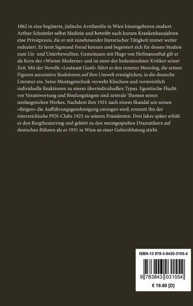 Arthur Schnitzler: Die Frau des Richters Erstdruck: Vossische Zeitung, Berlin, August 1925. Vollständige Neuausgabe mit einer Biographie des Autors. Herausgegeben von Karl-Maria Guth. Berlin 2015. Textgrundlage ist die Ausgabe: Arthur Schnitzler: Gesammelte Werke. Die erzählenden Schriften, 2 Bände, Frankfurt a.M.: S. Fischer Verlag, 1961. Die Paginierung obiger Ausgabe wird in dieser Neuausgabe als Marginalie zeilengenau mitgeführt. Umschlaggestaltung von Thomas Schultz-Overhage unter Verwendung des Bildes: George Frederick Watts, Mary, 1880. Gesetzt aus Minion Pro, 11 pt. Über den Autor: 1862 in eine begüterte, jüdische Arztfamilie in Wien hineingeboren studiert Arthur Schnitzler selbst Medizin und betreibt nach kurzen Krankenhausjahren eine Privatpraxis, die er mit zunehmender literarischer Tätigkeit immer weiter reduziert. Er lernt Sigmund Freud kennen und begeistert sich für dessen Studien zum Un- und Unterbewußten. Gemeinsam mit Hugo von Hofmannsthal gilt er als Kern der »Wiener Moderne« und ist einer der bedeutendsten Kritiker seiner Zeit. Mit der Novelle »Leutnant Gustl« führt er den inneren Monolog, die seinen Figuren assoziative Reaktionen auf ihre Umwelt ermöglichen, in die deutsche Literatur ein. Seine Montagetechnik verwebt Klischees und vermeintlich individuelle Reaktionen zu einem überindividuellen Typus. Egoistische Flucht vor Verantwortung und Bindungsängste sind zentrale Themen seines umfangreichen Werkes. Nachdem ihm 1921 nach einem Skandal um seinen »Reigen« die Aufführungsgenehmigung entzogen wird, ernennt ihn der österreichische PEN-Clubs 1923 zu seinem Präsidenten. Drei Jahre später erhält er den Burgtheaterring und gehört zu den meistgespielten Dramatikern auf deutschen Bühnen als er 1931 in Wien an einer Gehirnblutung stirbt.