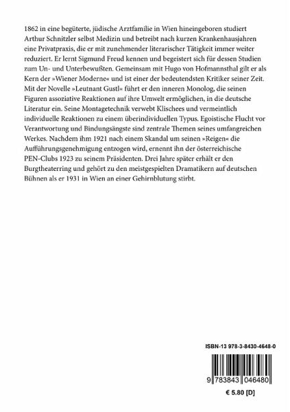 Arthur Schnitzler: Die Frau des Weisen und andere Erzählungen Ein Abschied: Erstdruck: Neue Deutsche Rundschau, VII. Jahrg., 2. Heft, Februar 1896. Der Empfindsame: Erstdruck: Die Neue Rundschau, XL. Jahrgang, 5. Heft, Mai 1932. Die Frau des Weisen: Erstdruck: Die Zeit, X. Band, Nr. 118¿120, Wien, 2., 9. u. 16. Januar 1897. Der Ehrentag: Erstdruck: Die Romanwelt, V. Jahrgang, I. Band, 16. Heft, Berlin, 1897. Die Toten schweigen: Erstdruck: Cosmopolis, VIII. Jahrgang, Nr. 22, Oktober 1897. Vollständige Neuausgabe mit einer Biographie des Autors. Herausgegeben von Karl-Maria Guth. Berlin 2015. Textgrundlage ist die Ausgabe: Arthur Schnitzler: Gesammelte Werke. Die erzählenden Schriften, 2 Bände, Frankfurt a.M.: S. Fischer Verlag, 1961. Die Paginierung obiger Ausgabe wird in dieser Neuausgabe als Marginalie zeilengenau mitgeführt. Umschlaggestaltung von Thomas Schultz-Overhage unter Verwendung des Bildes: Egon Schiele, Die Schlafende, 1911. Gesetzt aus Minion Pro, 11 pt. Über den Autor: 1862 in eine begüterte, jüdische Arztfamilie in Wien hineingeboren studiert Arthur Schnitzler selbst Medizin und betreibt nach kurzen Krankenhausjahren eine Privatpraxis, die er mit zunehmender literarischer Tätigkeit immer weiter reduziert. Er lernt Sigmund Freud kennen und begeistert sich für dessen Studien zum Un- und Unterbewußten. Gemeinsam mit Hugo von Hofmannsthal gilt er als Kern der »Wiener Moderne« und ist einer der bedeutendsten Kritiker seiner Zeit. Mit der Novelle »Leutnant Gustl« führt er den inneren Monolog, die seinen Figuren assoziative Reaktionen auf ihre Umwelt ermöglichen, in die deutsche Literatur ein. Seine Montagetechnik verwebt Klischees und vermeintlich individuelle Reaktionen zu einem überindividuellen Typus. Egoistische Flucht vor Verantwortung und Bindungsängste sind zentrale Themen seines umfangreichen Werkes. Nachdem ihm 1921 nach einem Skandal um seinen »Reigen« die Aufführungsgenehmigung entzogen wird, ernennt ihn der österreichische PEN-Clubs 1923 zu seinem Präsidenten. Drei Jahre später erhält er den Burgtheaterring und gehört zu den meistgespielten Dramatikern auf deutschen Bühnen als er 1931 in Wien an einer Gehirnblutung stirbt.