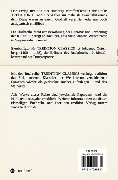 Dieses Werk ist Teil der Buchreihe TREDITION CLASSICS. Der Verlag tredition aus Hamburg veröffentlicht in der Buchreihe TREDITION CLASSICS Werke aus mehr als zwei Jahrtausenden. Diese waren zu einem Großteil vergriffen oder nur noch antiquarisch erhältlich. Mit der Buchreihe TREDITION CLASSICS verfolgt tredition das Ziel, tausende Klassiker der Weltliteratur verschiedener Sprachen wieder als gedruckte Bücher zu verlegen und das weltweit! Die Buchreihe dient zur Bewahrung der Literatur und Förderung der Kultur. Sie trägt so dazu bei, dass viele tausend Werke nicht in Vergessenheit geraten.