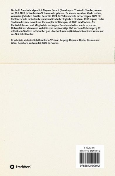 Berthold Auerbach, eigentlich Moyses Baruch (Pseudonym: Theobald Chauber) wurde am 28.2.1812 in Nordstetten/Schwarzwald geboren. Er stammt aus einer kinderreichen, verarmten jüdischen Familie, besuchte 1824 die Talmudschule in Hechingen, 1827 die Rabbinerschule in Karlsruhe zum israelitisch-theologischen Studium. 1832 begann er das Studium der Jura, danach der Philosophie in Tübingen, ab 1833 in München. Als Radikal-Liberaler und Mitglied der verfolgten Burschenschaften wurde er von der Universität verwiesen und verbüßte eine zweimonatige Haft auf dem Hohenasperg. Er schloß sein Studium in Heidelberg ab. Auerbach war mitGutzkowbekannt und wurde nur aus Not Schriftsteller. Er arbeitete als freier Schriftsteller in Weimar, Leipzig, Dresden, Berlin, Breslau und Wien. Auerbach starb am 8.2.1882 in Cannes.