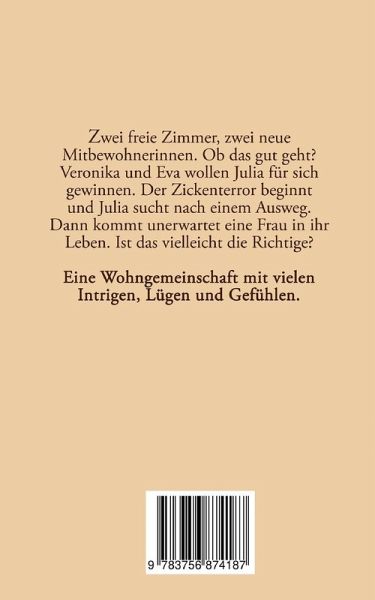Zwei freie Zimmer, zwei neue Mitbewohnerinnen. Ob das gut geht?Veronika und Eva wollen Julia für sich gewinnen. Der Zickenterror beginnt und Julia sucht nach einem Ausweg.Dann kommt unerwartet eine Frau in ihr Leben. Ist das vielleicht die Richtige?Eine Wohngemeinschaft mit vielen Intrigen, Lügen und Gefühlen.