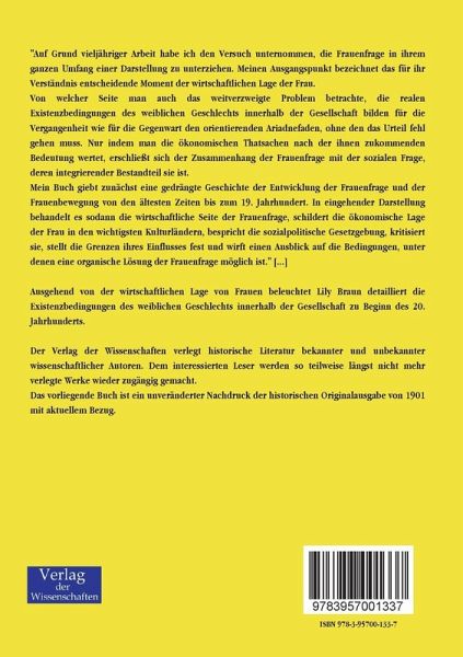 Ausgehend von der wirtschaftlichen Lage von Frauen beleuchtet Lily Braun detailliert die Existenzbedingungen des weiblichen Geschlechts innerhalb der Gesellschaft zu Beginn des 20. Jahrhunderts.