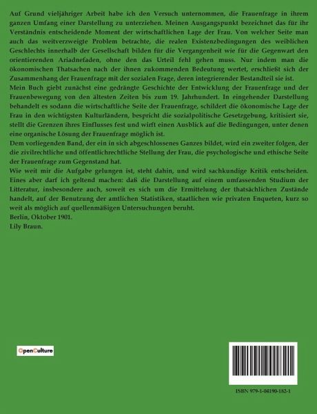 Auf Grund vieljähriger Arbeit habe ich den Versuch unternommen, die Frauenfrage in ihrem ganzen Umfang einer Darstellung zu unterziehen. Meinen Ausgangspunkt bezeichnet das für ihr Verständnis entscheidende Moment der wirtschaftlichen Lage der Frau. Von welcher Seite man auch das weitverzweigte Problem betrachte, die realen Existenzbedingungen des weiblichen Geschlechts innerhalb der Gesellschaft bilden für die Vergangenheit wie für die Gegenwart den orientierenden Ariadnefaden, ohne den das Urteil fehl gehen muss. Nur indem man die ökonomischen Thatsachen nach der ihnen zukommenden Bedeutung wertet, erschließt sich der Zusammenhang der Frauenfrage mit der sozialen Frage, deren integrierender Bestandteil sie ist. Mein Buch giebt zunächst eine gedrängte Geschichte der Entwicklung der Frauenfrage und der Frauenbewegung von den ältesten Zeiten bis zum 19. Jahrhundert. In eingehender Darstellung behandelt es sodann die wirtschaftliche Seite der Frauenfrage, schildert die ökonomische Lage der Frau in den wichtigsten Kulturländern, bespricht die sozialpolitische Gesetzgebung, kritisiert sie, stellt die Grenzen ihres Einflusses fest und wirft einen Ausblick auf die Bedingungen, unter denen eine organische Lösung der Frauenfrage möglich ist. Dem vorliegenden Band, der ein in sich abgeschlossenes Ganzes bildet, wird ein zweiter folgen, der die zivilrechtliche und öffentlichrechtliche Stellung der Frau, die psychologische und ethische Seite der Frauenfrage zum Gegenstand hat. Wie weit mir die Aufgabe gelungen ist, steht dahin, und wird sachkundige Kritik entscheiden. Eines aber darf ich geltend machen: daß die Darstellung auf einem umfassenden Studium der Litteratur, insbesondere auch, soweit es sich um die Ermittelung der thatsächlichen Zustände handelt, auf der Benutzung der amtlichen Statistiken, staatlichen wie privaten Enqueten, kurz so weit als möglich auf quellenmäßigen Untersuchungen beruht. Berlin, Oktober 1901. Lily Braun.