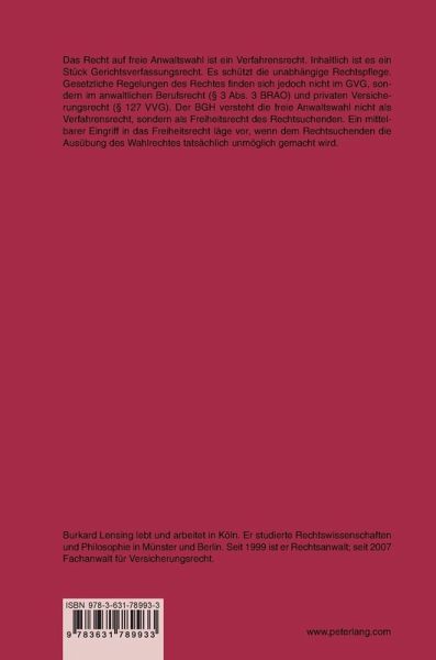 Das Recht auf freie Anwaltswahl ist ein Verfahrensrecht. Inhaltlich ist es ein Stück Gerichtsverfassungsrecht. Es schützt die unabhängige Rechtspflege. Gesetzliche Regelungen des Rechtes finden sich jedoch nicht im GVG, sondern im anwaltlichen Berufsrecht (§ 3 Abs. 3 BRAO) und privaten Versicherungsrecht (§ 127 VVG). Der BGH versteht die freie Anwaltswahl nicht als Verfahrensrecht, sondern als Freiheitsrecht des Rechtsuchenden. Ein mittelbarer Eingriff in das Freiheitsrecht läge vor, wenn dem Rechtsuchenden die Ausübung des Wahlrechtes tatsächlich unmöglich gemacht wird.