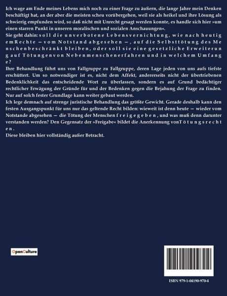 Ich wage am Ende meines Lebens mich noch zu einer Frage zu äußern, die lange Jahre mein Denken beschäftigt hat, an der aber die meisten scheu vorübergehen, weil sie als heikel und ihre Lösung als schwierig empfunden wird, so daß nicht mit Unrecht gesagt werden konnte, es handle sich hier »um einen starren Punkt in unseren moralischen und sozialen Anschauungen«. Sie geht dahin: s o l l d i e u n v e r b o t e n e L e b e n s v e r n i c h t u n g , w i e n a c h h e u t i g e m R e c h t e ¿ v o m N o t s t a n d a b g e s e h e n ¿ , a u f d i e S e l b s t t ö t u n g d e s M e n s c h e n b e s c h r ä n k t b l e i b e n , o d e r s o l l s i e e i n e g e s e t z l i c h e E r w e i t e r u n g a u f T ö t u n g e n v o n N e b e n m e n s c h e n e r f a h r e n u n d i n w e l c h e m U m f a n g e ? Ihre Behandlung führt uns von Fallgruppe zu Fallgruppe, deren Lage jeden von uns aufs tiefste erschüttert. Um so notwendiger ist es, nicht dem Affekt, andererseits nicht der übertriebenen Bedenklichkeit das entscheidende Wort zu überlassen, sondern es auf Grund bedächtiger rechtlicher Erwägung der Gründe für und der Bedenken gegen die Bejahung der Frage zu finden. Nur auf solch fester Grundlage kann weiter gebaut werden. Ich lege demnach auf strenge juristische Behandlung das größte Gewicht. Gerade deshalb kann den festen Ausgangspunkt für uns nur das geltende Recht bilden: wieweit ist denn heute ¿ wieder vom Notstande abgesehen ¿ die Tötung der Menschen f r e i g e g e b e n , und was muß denn darunter verstanden werden? Den Gegensatz der »Freigabe« bildet die Anerkennung vonT ö t u n g s r e c h t e n . Diese bleiben hier vollständig außer Betracht.