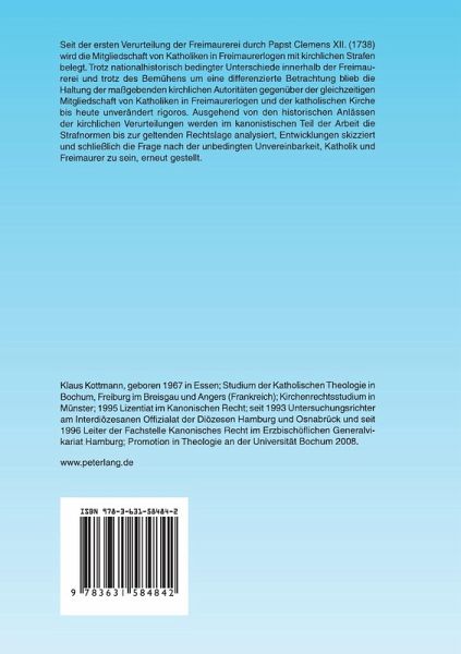 Seit der ersten Verurteilung der Freimaurerei durch Papst Clemens XII. (1738) wird die Mitgliedschaft von Katholiken in Freimaurerlogen mit kirchlichen Strafen belegt. Trotz nationalhistorisch bedingter Unterschiede innerhalb der Freimaurerei und trotz des Bemühens um eine differenzierte Betrachtung blieb die Haltung der maßgebenden kirchlichen Autoritäten gegenüber der gleichzeitigen Mitgliedschaft von Katholiken in Freimaurerlogen und der katholischen Kirche bis heute unverändert rigoros. Ausgehend von den historischen Anlässen der kirchlichen Verurteilungen werden im kanonistischen Teil der Arbeit die Strafnormen bis zur geltenden Rechtslage analysiert, Entwicklungen skizziert und schließlich die Frage nach der unbedingten Unvereinbarkeit, Katholik und Freimaurer zu sein, erneut gestellt.