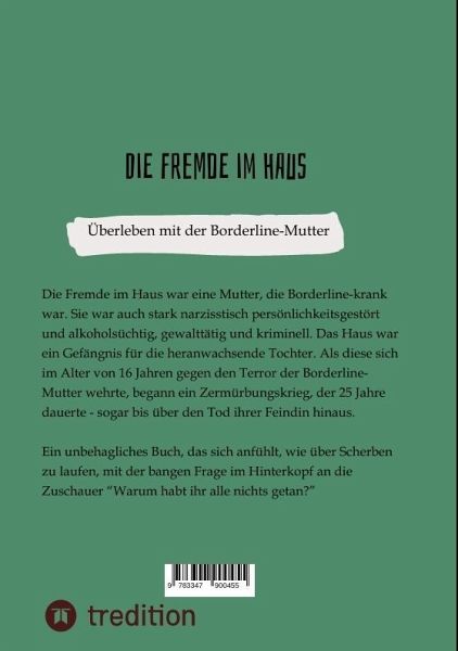 Eine Mutter ist schwer psychisch krank - sie hat Borderline und ist narzisstisch persönlichkeitsgestört. Was bedeutet das aber für das Kind, das in dieser Familie heranwächst? Wie geht man mit einer Bezugsperson um, die nicht gesund ist? Das Buch "Die Fremde im Haus - Überleben mit der Borderline-Mutter" schildert anschaulich den Alltag der jungen Tochter einer Borderlinerin und wie sie es geschafft hat, ohne fremde Hilfe ein eigenständiges Leben aufzubauen.