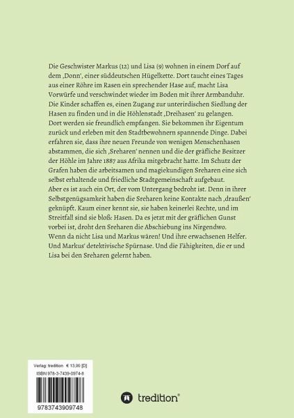 Dort werden sie freundlich empfangen. Sie bekommen ihr Eigentum zurück und erleben mit den Stadtbewohnern spannende Dinge. Dabei erfahren sie, dass ihre neuen Freunde von wenigen Menschenhasen abstammen, die sich 'Sreharen' nennen und die der gräfliche Besitzer der Höhle im Jahre 1887 aus Afrika mitgebracht hatte. Im Schutz der Grafen haben die arbeitsamen und magiekundigen Sreharen eine sich selbst erhaltende und friedliche Stadtgemeinschaft aufgebaut.