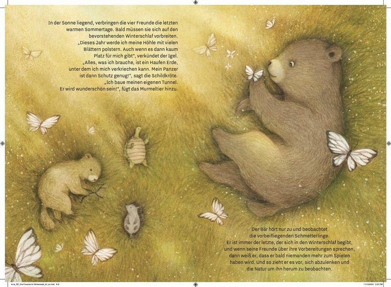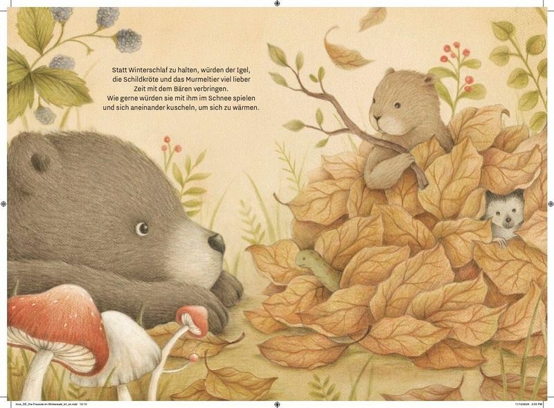 Der Bär, der Igel, die Schildkröte und das Murmeltier begeben sich in ihrenWinterschlaf. Als ein Sturm ihren Unterschlupf zerstört, bringt der Bär alles wiederfür sie in Ordnung.Doch bevor er sich in seine warme Höhle zurückziehen kann, schläft er draußenim Schnee ein. Aber seine Freunde lassen ihn nicht im Stich und sorgen dafür, dasser nicht friert.- Vermittelt wichtige Werte wie Hilfsbereitschaft und Zusammenhalt in schwierigen Zeiten- Hochwertige Illustrationen: Jede Seite ist reich illustriert und steckt voller liebevoller Details, die die Fantasie der Kinder anregen- Zum kuscheligen Vorlesen an kalten Winterabenden- Für Kinder ab 3 Jahren