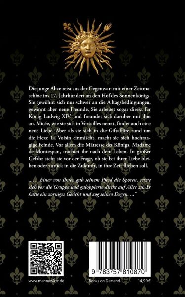 Die junge Alice reist aus der Gegenwart mit einer Zeitmaschine ins 17. Jahrhundert an den Hof des Sonnenkönigs. Sie gewöhnt sich nur schwer an die Alltagsbedingungen, entdeckt aber neue Freunde. Sie arbeitet sogar direkt für den König und nähert sich ihm darüber an. Alicée, wie sie sich in Versailles nennt, findet auch eine neue Liebe. Aber als sie sich in die Giftaffäre rund um die Hexe La Voisin einmischt, macht sie sich hochrangige Feinde. Vor allem die Mätresse des Königs, Madame de Montespan, trachtet ihr nach dem Leben. In großer Gefahr steht sie vor der Frage, ob sie bei ihrer Liebe bleiben oder zurück in die Zukunft, in ihre Zeit fliehen soll.…mehr
