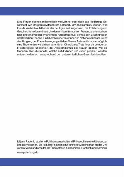 Sind Frauen ebenso antisemitisch wie Männer oder doch das friedfertige Geschlecht, wie Margarete Mitscherlich beteuert? Um das klären zu können, wird Freuds Weiblichkeitstheorie der heutigen Zeit angepasst, die Entstehung von Geschlechterrollen erörtert. Um den Antisemitismus von Frauen zu untersuchen, folgt eine Analyse des Phänomens Antisemitismus, gemäß den Erkenntnissen der Kritischen Theorie. Ein Überblick über Täterinnen im Nationalsozialismus und den Umgang der Frauenbewegung mit dem Thema Antisemitismus ermöglicht eine Theorie des weiblichen autoritären Charakters: Trotz ihrer oft beteuerten Friedfertigkeit funktioniert der Antisemitismus bei Frauen ebenso wie bei Männern. Bloß die Inhalte, welche auf Jüdinnen und Juden projiziert werden, unterscheiden sich entsprechend den unterschiedlichen Geschlechterrollen.