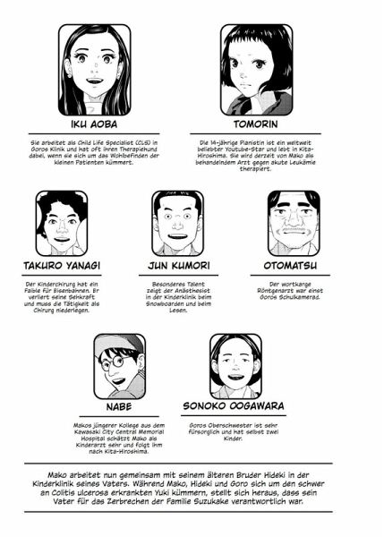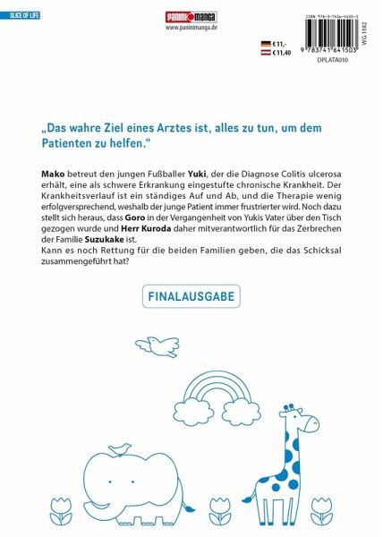 Erlebe das Leben eines Kinderarztes für Groß und Klein! Begleite Kinderarzt Mako Suzukake in seine Welt der Kinderheilkunde, in der die Kleinen erst dann auch gesund gepflegt sind, wenn er ihnen ein Lächeln auf ihr Gesicht zauber kann! Und manchmal bedeutet ein Kinderarzt zu sein auch nicht nur, dass man sich um die Sorgen der Kleinen, aber auch der Großen kümmert ... Das erwartet dich in Band 10: "Das wahre Ziel eines Arztes ist, alles zu tun, um dem Patienten zu helfen." Mako betreut den jungen Fußballer Yuki, der die Diagnose Colitis ulcerosa erhält, eine als schwere Erkrankung eingestufte chronische Krankheit. Der Krankheitsverlauf ist ein ständiges Auf und Ab, und die Therapie wenig erfolgversprechend, weshalb der junge Patient immer frustrierter wird. Noch dazu stellt sich heraus, dass Goro in der Vergangenheit von Yukis Vater über den Tisch gezogen wurde und Herr Kuroda daher mitverantwortlich für das Zerbrechen der Familie Suzukake ist. Kann es noch Rettung für die beidenFamilien geben, die das Schicksal zusammengeführt hat?FINALAUSGABEFür Fans von Slice-of-Life, Drama und rührenden Manga!