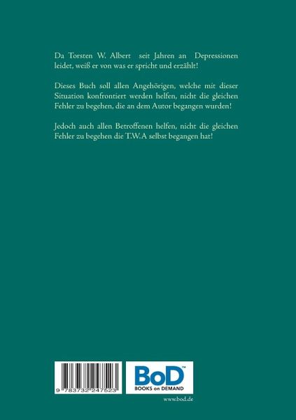 Da Torsten W. Albert seit Jahren an Depressionen leidet, weiß er von was er spricht und erzählt!Dieses Buch soll allen Angehörigen, welche mit dieser Situation konfrontiert werden helfen, nicht die gleichen Fehler zu begehen, die an dem Autor begangen wurden! Jedoch auch allen Betroffenen helfen, nicht die gleichen Fehler zu begehen die T.W.A selbst begangen hat!