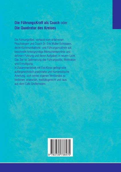 Die FührungsKraft als Coach oder Die Quadratur des KreisesDie Führungsfibel, verfasst vom erfahrenen Psychologen und Coach Dr. Erik Müller-Schoppen, deckt Kommunikations- und Führungsroutinen auf, beschreibt hintergründige Menschenkenntnis und definiert Führung und deren Aufgaben in neuem Licht.Das Ziel ist Optimierung des Führungsstils, Motivation und Ermutigung.In Zusammenarbeit mit Eva Kloss gelingt eine außergewöhnlich praxisnahe und humanistische Anleitung, sich seines eigenen Verstandes zu bedienen, praxisnah, realitätsgerecht und raus aus dem Café Größenwahn.