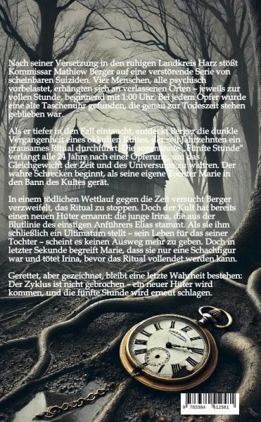 Nach seiner Versetzung in den ruhigen Landkreis Harz stößt Kommissar Mathiew Berger auf eine verstörende Serie von scheinbaren Suiziden. Vier Menschen, alle psychisch vorbelastet, erhängten sich an verlassenen Orten - jeweils zur vollen Stunde, beginnend mit 1:00 Uhr. Bei jedem Opfer wurde eine alte Taschenuhr gefunden, die genau zur Todeszeit stehen geblieben war.Als er tiefer in den Fall eintaucht, entdeckt Berger die dunkle Vergangenheit eines okkulten Kultes, der seit Jahrzehnten ein grausames Ritual durchführt. Die sogenannte "Fünfte Stunde" verlangt alle 24 Jahre nach einer Opferung, um das Gleichgewicht der Zeit und des Universums zu wahren. Der wahre Schrecken beginnt, als seine eigene Tochter Marie in den Bann des Kultes gerät.In einem tödlichen Wettlauf gegen die Zeit versucht Berger verzweifelt, das Ritual zu stoppen. Doch der Kult hat bereits einen neuen Hüter ernannt: die junge Irina, die aus der Blutlinie des einstigen Anführers Elias stammt. Als sie ihm schließlichein Ultimatum stellt - sein Leben für das seiner Tochter - scheint es keinen Ausweg mehr zu geben. Doch in letzter Sekunde begreift Marie, dass sie nur eine Schachfigur war und tötet Irina, bevor das Ritual vollendet werden kann.Gerettet, aber gezeichnet, bleibt eine letzte Wahrheit bestehen: Der Zyklus ist nicht gebrochen - ein neuer Hüter wird kommen, und die fünfte Stunde wird erneut schlagen.
