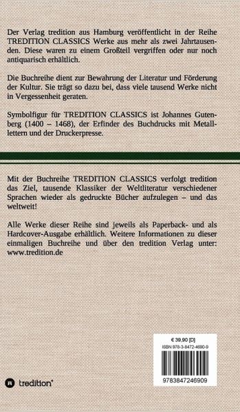 Diese Hardcover-Ausgabe ist Teil der TREDITION CLASSICS. Der Verlag tredition aus Hamburg veröffentlicht in der Buchreihe TREDITION CLASSICS Werke aus mehr als zwei Jahrtausenden. Diese waren zu einem Großteil vergriffen oder nur noch antiquarisch erhältlich. Mit TREDITION CLASSICS verfolgt tredition das Ziel, tausende Klassiker der Weltliteratur verschiedener Sprachen wieder als gedruckte Bücher zu verlegen und das weltweit! Die Buchreihe dient zur Bewahrung der Literatur und Förderung der Kultur. Sie trägt so dazu bei, dass viele tausend Werke nicht in Vergessenheit geraten.