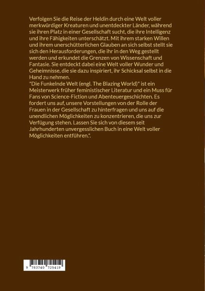 Verfolgen Sie die Reise der Heldin durch eine Welt voller merkwürdiger Kreaturen und unentdeckter Länder, während sie ihren Platz in einer Gesellschaft sucht, die ihre Intelligenz und ihre Fähigkeiten unterschätzt. Mit ihrem starken Willen und ihrem unerschütterlichen Glauben an sich selbst stellt sie sich den Herausforderungen, die ihr in den Weg gestellt werden und erkundet die Grenzen von Wissenschaft und Fantasie. Sie entdeckt dabei eine Welt voller Wunder und Geheimnisse, die sie dazu inspiriert, ihr Schicksal selbst in die Hand zu nehmen."Die funkelnde Welt (engl. The Blazing World)" ist ein Meisterwerk früher feministischer Literatur und ein Muss für Fans von Science-Fiction und Abenteuergeschichten. Es fordert uns auf, unsere Vorstellungen von der Rolle der Frauen in der Gesellschaft zu hinterfragen und uns auf die unendlichen Möglichkeiten zu konzentrieren, die uns zur Verfügung stehen. Lassen Sie sich von diesem seit Jahrhunderten unvergesslichen Buch in eine Welt voller Möglichkeiten entführen.".