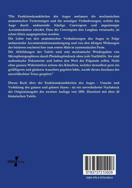 Dieses Buch über die Funktionskrankheiten des Auges - Ursache und Verhütung des grauen undgrünen Stares - ist ein unveränderter Nachdruck der Originalausgabe der zweiten Auflage von 1893. Illustriert mit über 20 historischen Tafeln.