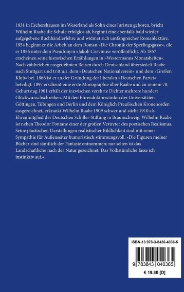 1831 in Eschershausen im Weserland als Sohn eines Juristen geboren, bricht Wilhelm Raabe die Schule erfolglos ab, beginnt eine ebenfalls bald wieder aufgegebene Buchhändlerlehre und widmet sich umfangreicher Romanlektüre. 1854 beginnt er die Arbeit an dem Roman "Die Chronik der Sperlingsgasse", die er 1856 unter dem Pseudonym "Jakob Corvinus" veröffentlicht. Ab 1857 erscheinen seine historischen Erzählungen in "Westermanns Monatsheften". Nach zahlreichen ausgedehnten Reisen durch Deutschland übersiedelt Raabe nach Stuttgart und tritt u.a. dem "Deutschen Nationalverein" und dem "Großen Klub" bei. 1866 ist er an der Gründung der liberalen "Deutschen Partei" beteiligt. 1897 erscheint eine erste Monographie über Raabe und zu seinem 70. Geburtstag 1901 erhält der inzwischen verehrte Dichter mehrere hundert Glückwunschschreiben. Mit den Ehrendoktorwürden der Universitäten Göttingen, Tübingen und Berlin und dem Königlich Preußischen Kronenorden ausgezeichnet, erkrankt Wilhelm Raabe 1909 schwer und stirbt 1910 als Ehrenmitglied der Deutschen Schiller-Stiftung in Braunschweig. Wilhelm Raabe ist neben Theodor Fontane einer der großen Vertreter des poetischen Realismus. Seine plastischen Darstellungen realistischer Bildlichkeit sind mit seiner Sympathie für Außenseiter humoristisch stimmungsvoll. "Die Figuren meiner Bücher sind sämtlich der Fantasie entnommen; nur selten ist das Landschaftliche nach der Natur gezeichnet. Das Volkstümliche fasse ich instinktiv auf."