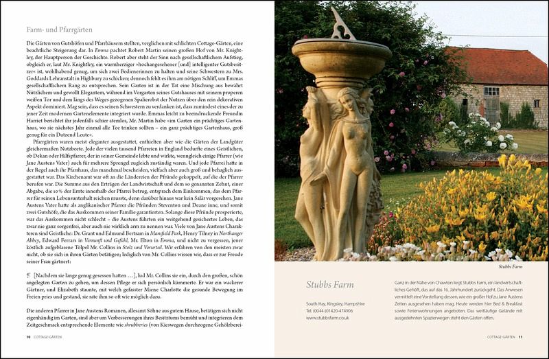 Jane Austen liebte die Vielfalt der Gärten. Dies zeigen die hier vorgestellten grünen Oasen, die sie selbst besaß oder kannte. Dazu zählen die Gärten ihrer Verwandten und Freunde, die öffentlichen Parks, die Landhaus- und Stadtgärten oder die Gärten der Schlösser und Herrenhäuser der georgianischen Epoche, die Schauplätze ihrer Romane und Verfilmungen waren. Stimmungsvolle Fotografien, zeitgenössische Radierungen und Skizzen von Bath, London, Hampshire oder Kent vermitteln ein Garten-Panorama, das die Zeit Jane Austens lebendig macht. Ergänzt werden sie durch Zitate aus ihren Briefen sowie Auszügen aus ihren Romanen.