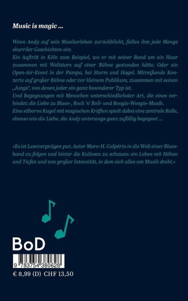 Der Titel ist Programm...... denn um die Gage geht es, mit der Andy, der Pianist einer Bluesband, sein Musikstudium finanziert. Aber natürlich nicht allein darum, sondern um die vielen Erlebnisse und Begegnungen, die er und seine Kollegen bei ihren Auftritten als Blues-, Rock 'n' Roll- und Boogie-Formation erfahren.Andy blickt zurück, wobei ihm eine magische Silberkugel den Weg weist (!), und erinnert sich an einen legendären Auftritt in Köln, wo sie beinahe mit Weltstars auf einer Bühne gestanden hätten. Oder an ein Open Air in der Pampa, bei Sturm und Hagel. Oder die ersten Studioaufnahmen mit ihm und seinen "Jungs", von denen jeder ein ganz besonderer Typ ist.Zum vierzigsten Jubiläum trifft Andy seine ehemaligen Bandmitglieder wieder, und sie lassen die alten Zeiten musikalisch aufleben. Schön und hinreißend, mit dabei zu sein!Es ist eine vielseitige Anekdotensammlung, die der Autor Marc-H. Galpérin hier vorlegt, und so dem Leser Einblick das bewegte Leben einer Blues- und Boogieband gewährt.Unterhaltsam, witzig und tiefgründig zugleich!